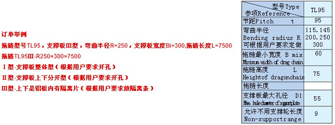 TL95型鋼制拖鏈按結(jié)構(gòu)可分為TL型鋼制拖鏈和TLG型鋼制拖鏈,鋼制拖鏈按節(jié)距分類有45、65、75、95、100、125、180、225、250型。拖鏈寬度可按用戶要求定做,彎曲半徑從50-800之間。有三種支撐板的形式。(1)當拖鏈需承載較大管、纜負荷時、應選用高強度支撐板——整塊式(2)當管纜的管接頭尺寸大于支撐板內(nèi)腔孔徑或須經(jīng)常拆裝、維修等時。可選用支撐板——分開式(3)安裝管纜的規(guī)格品種較多時,可選用支撐板——框架式。