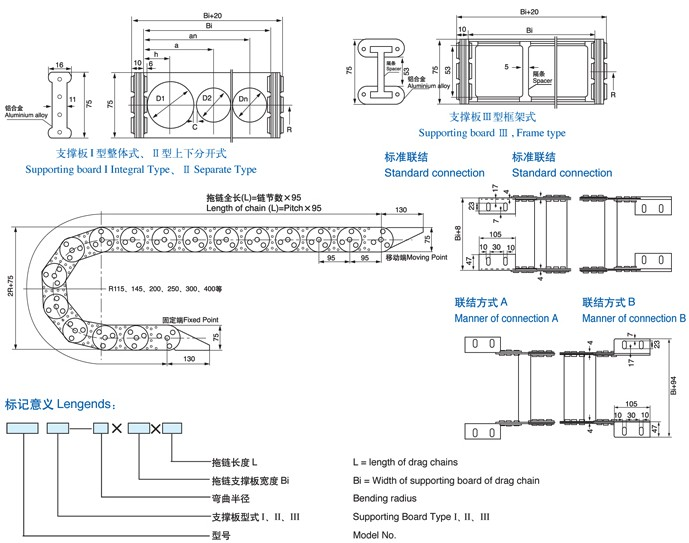 TL95型鋼制拖鏈按結(jié)構(gòu)可分為TL型鋼制拖鏈和TLG型鋼制拖鏈,鋼制拖鏈按節(jié)距分類有45、65、75、95、100、125、180、225、250型。拖鏈寬度可按用戶要求定做,彎曲半徑從50-800之間。有三種支撐板的形式。(1)當拖鏈需承載較大管、纜負荷時、應選用高強度支撐板——整塊式(2)當管纜的管接頭尺寸大于支撐板內(nèi)腔孔徑或須經(jīng)常拆裝、維修等時??蛇x用支撐板——分開式(3)安裝管纜的規(guī)格品種較多時,可選用支撐板——框架式。