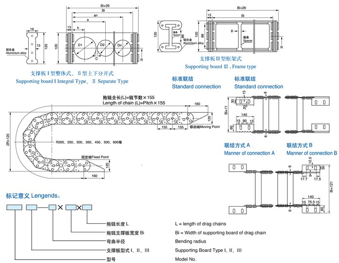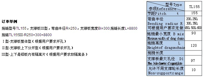 TL155型鋼制拖鏈按結(jié)構(gòu)可分為TL型鋼制拖鏈和TLG型鋼制拖鏈,鋼制拖鏈按節(jié)距分類有45、65、75、95、100、125、180、225、250型。拖鏈寬度可按用戶要求定做,彎曲半徑從50-800之間。有三種支撐板的形式。(1)當(dāng)拖鏈需承載較大管、纜負(fù)荷時(shí)、應(yīng)選用高強(qiáng)度支撐板——整塊式(2)當(dāng)管纜的管接頭尺寸大于支撐板內(nèi)腔孔徑或須經(jīng)常拆裝、維修等時(shí)??蛇x用支撐板——分開式(3)安裝管纜的規(guī)格品種較多時(shí),可選用支撐板——框架式。