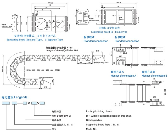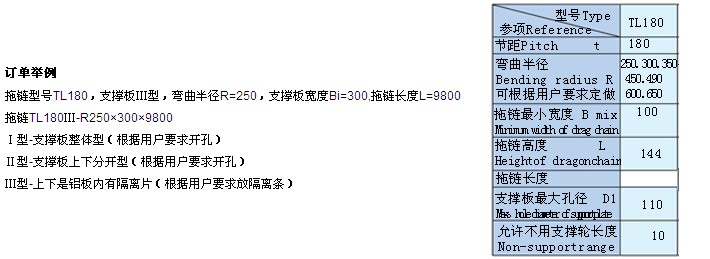 TL180型鋼制拖鏈按結(jié)構(gòu)可分為TL型鋼制拖鏈和TLG型鋼制拖鏈,鋼制拖鏈按節(jié)距分類有45、65、75、95、100、125、180、225、250型。拖鏈寬度可按用戶要求定做,彎曲半徑從50-800之間。有三種支撐板的形式。(1)當(dāng)拖鏈需承載較大管、纜負(fù)荷時、應(yīng)選用高強度支撐板——整塊式(2)當(dāng)管纜的管接頭尺寸大于支撐板內(nèi)腔孔徑或須經(jīng)常拆裝、維修等時??蛇x用支撐板——分開式(3)安裝管纜的規(guī)格品種較多時,可選用支撐板——框架式。